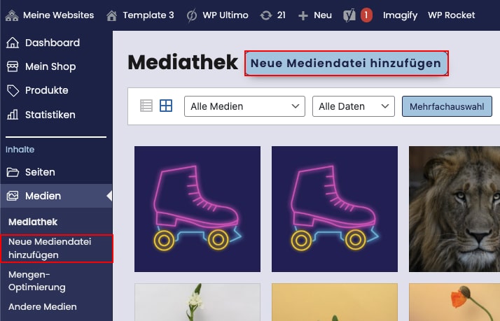 Links im Dashboard unter “Medien” werden alle Medien verwaltet und angezeigt. Zu den Medien zählen Bilder, Dokumente, Video und Audio. Sämtliche Medien sind in dieser Galerie hochzuladen, um sie anschließend auf der Website verwenden zu können.
