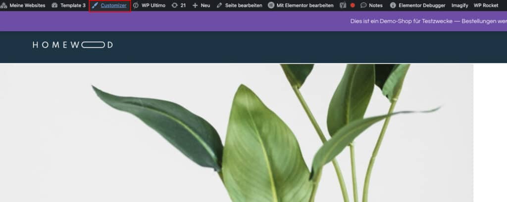 Website öffnen und oben im horizontalen Balken auf “Customizer” klicken