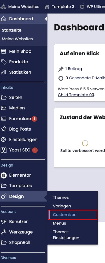 Oder im Dashboard zuerst über den Menüpunkt “Design” hovern und dann im Untermenü auf “Customizer” klicken. Nun ist der Bearbeitungsmodus aktiviert und die Website kann bearbeitet werden. Auf welche Art der Modus aktiviert wurde, ist unerheblich. Die Ansicht beim Bearbeiten ist dieselbe.