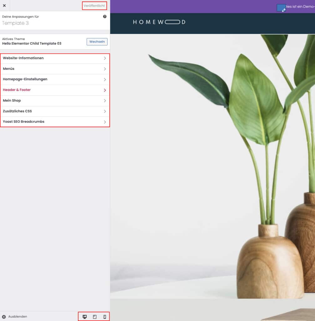 Der “Veröffentlicht”-Button ist der Speichern-Button. Es erfolgt keine automatische Speicherung der Änderungen. Änderungen müssen daher vor dem Schließen des Customizers durch den Klick auf den Button selbständig gespeichert werden.